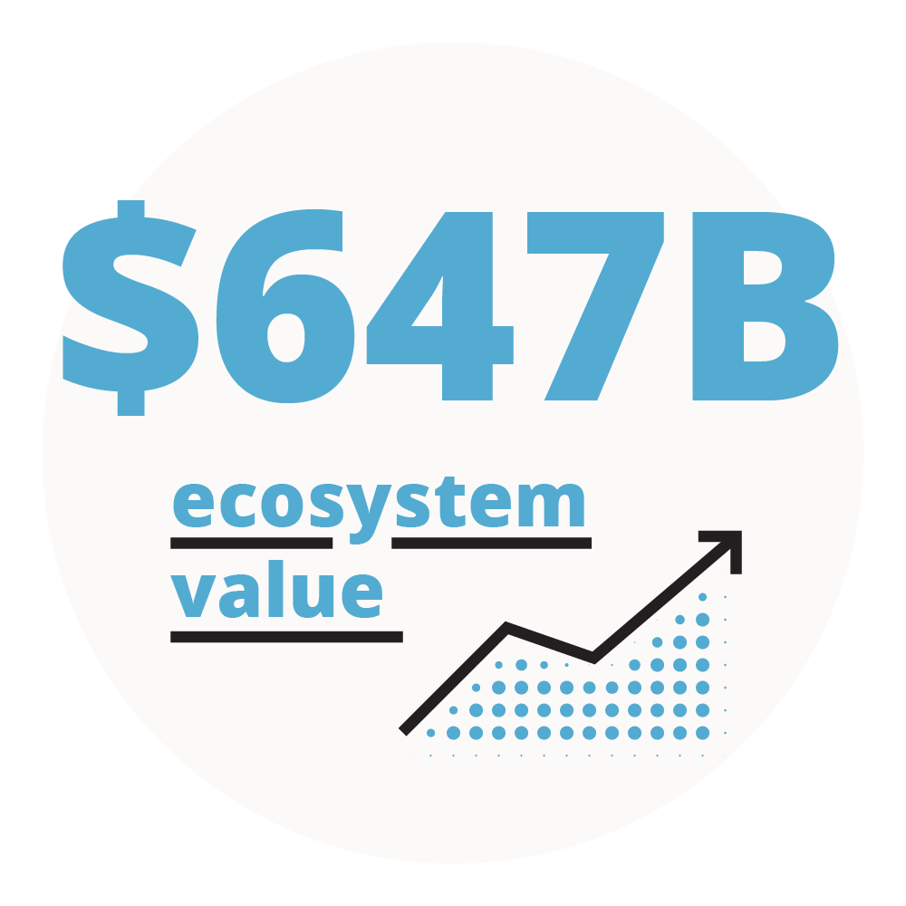The ecosystem value of New York tech in 2023. Even as valuations saw a market correction, the total value of New York startup valuations plus exits (132 startups in 2023) climbed to $647B.